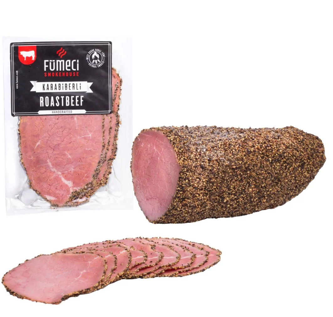 Özel olarak beslenen danaların en lezzetli bölgelerinden ürettiği ürünler ile bilinen firmamız bu ürününde de özel işlemler uygular. Karabiberli Roast Beef dana nuar kullanılarak yapılan ve özel baharat karışımımız ile lezzetlendirilen oldukça tercih edilen bir ürünümüzdür. Fümeci Smokehouse tarafından dana nuar kullanılarak yapılan ve özel olarak hazırlanmış olan Karabiberli Roast Beef, özel dinlendirme, fırınlama ve tütsüleme işleminden geçmiştir. Lezzetine doyamayacağınız, günün her saatinde tüketmek isteyeceğiniz bu ürünümüz Fümeci Smokehouse kalitesiyle sizlere sunulmaktadır.