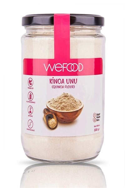 Wefood Glütensiz Kinoa Unu 330 gr Wefood Glutensiz Kinoa Unu 330 gr Wefood Glutensiz Kinoa Unu 330 gr Kinoa unu, kinoanın değirmende öğütülmesiyle elde edilen alternatif bir un çeşidini oluşturuyor. Kinoa ise ıspanakgiller familyasına ait Güney Amerika kökenli bir bitki olan chenopodium quinoa’dan tohum olarak çıkarılıyor. Tam tahıl özellikleri taşıyan kinoa ununun yapımında, ağırlıklı olarak beyaz kinoa kullanılıyor. Bu sayede kinoa unu, kullanıldığı tariflere yumuşak aromalı ve uyumlu bir lezzet veriyor.